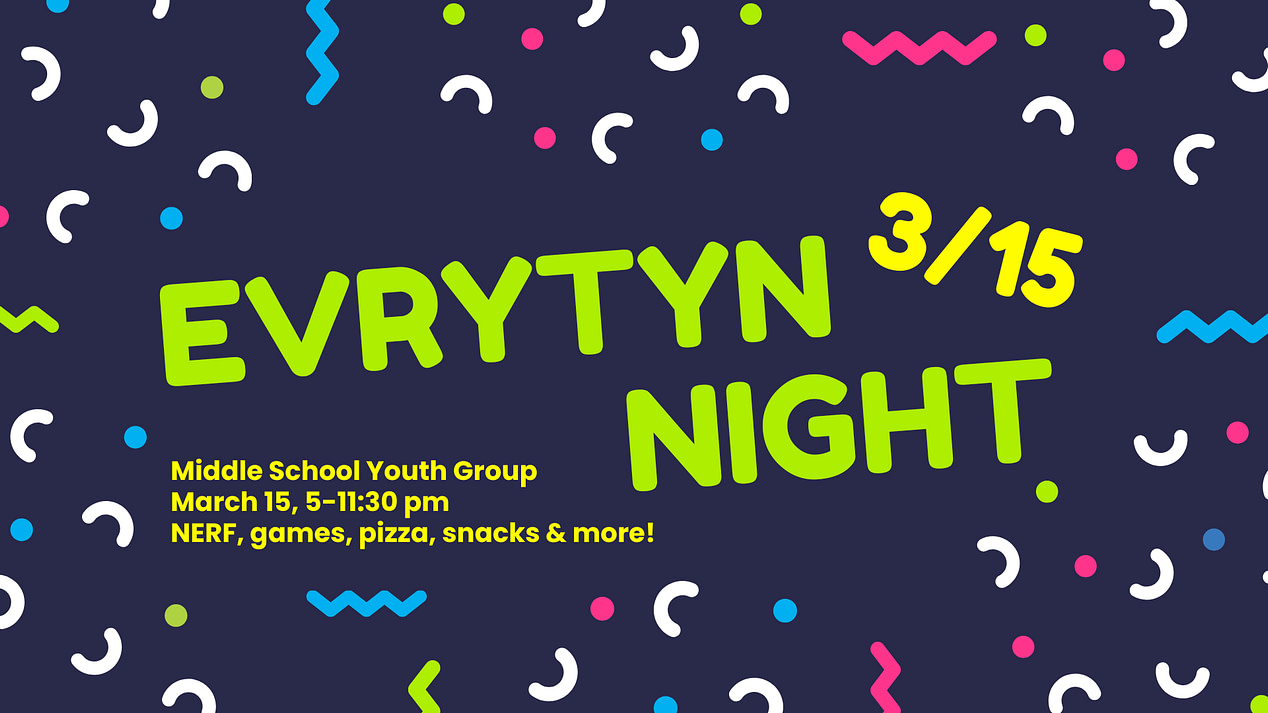 Middle School EVRYTYN Night is a big night of ALL THE THINGS our students have been asking to do: NERF, all-building scavenger hunt, Nintendo tournament, movie, games, pizza and popcorn and all the snacks.