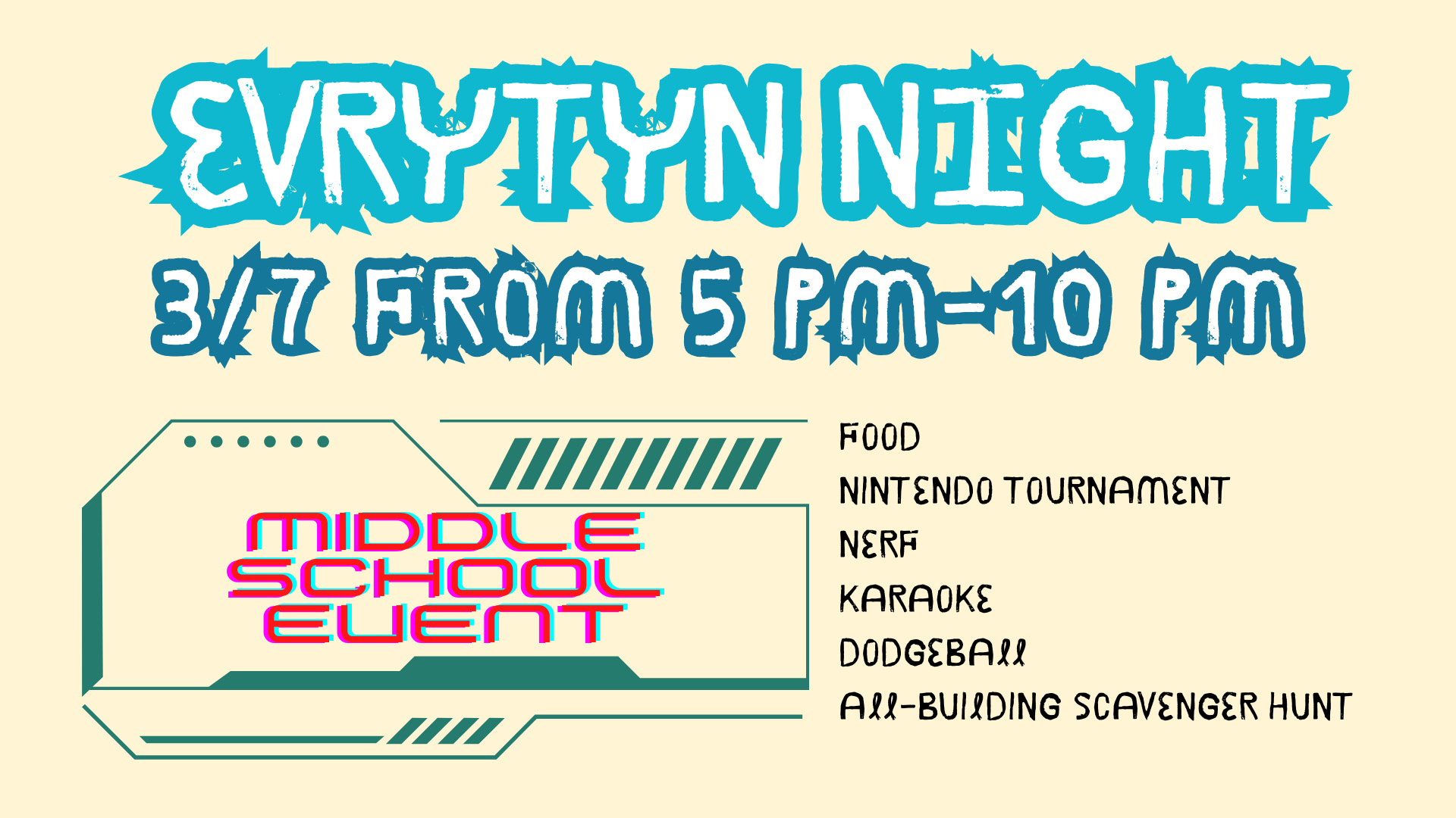Get ready for a night filled with EVRYTYN! Middle school students are invited to EVRYTYN Night — a high-energy evening packed with food, games, and fun. Chick-fil-A, a Nintendo tournament,…